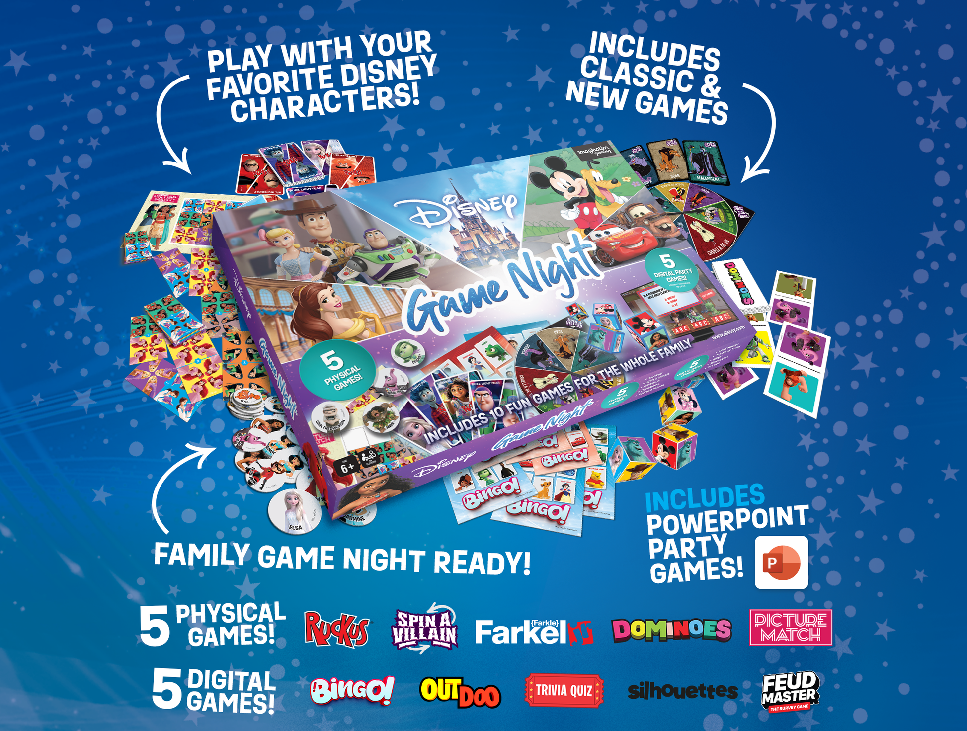 From trivia to Ruckus, and even Dominoes featuring your favorite Disney characters, this set has it all! Perfect for family gatherings, parties, or cozy nights in, it's an ideal gift for Disney fans or anyone looking to spice up their game nights. Recommended for ages 6+